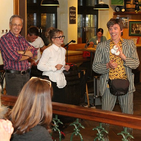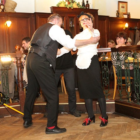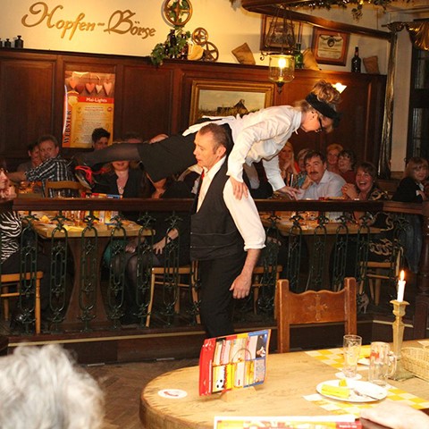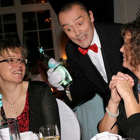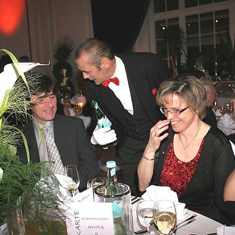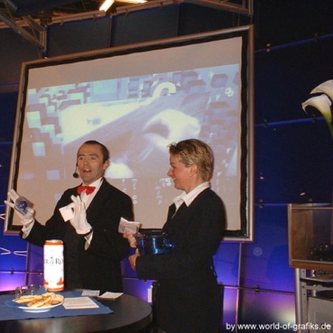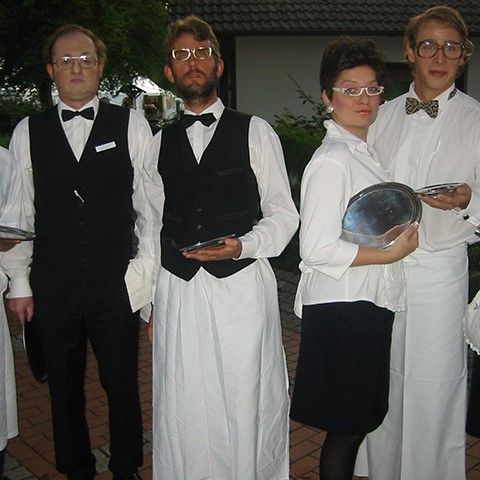 Zur Bewirtung der Gäste, zunächst sehr dezent, dann steigernd in den Aktionen. Bis hin zu Slapstick Einlagen und Showtime.